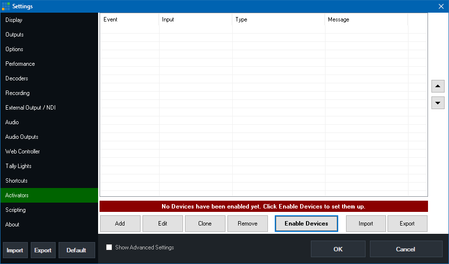 2. By default no devices (i.e MIDI or X-Keys controllers) are enabled, so to select the controller you wish to use click Enable Devices.