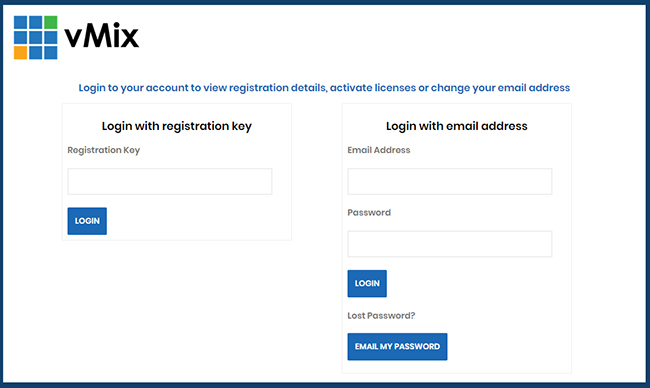 When logging in, enter either the vMix registration key you wish to check or alternatively, the email your key is registered to.