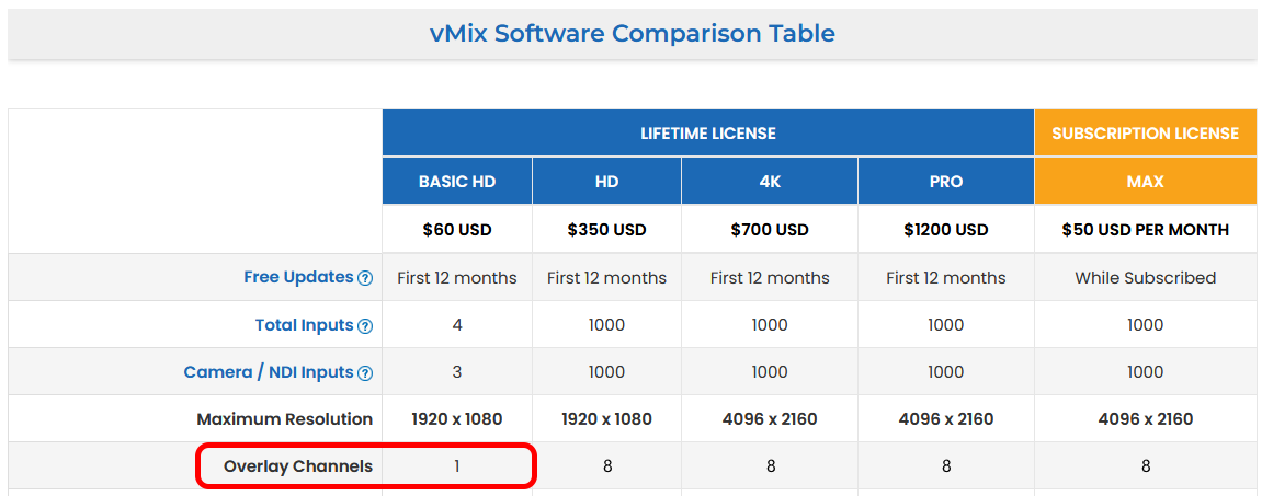 The Basic HD edition only supports 1x Overlay Channel, while all other editions of the software support all 8x Overlay Channels.