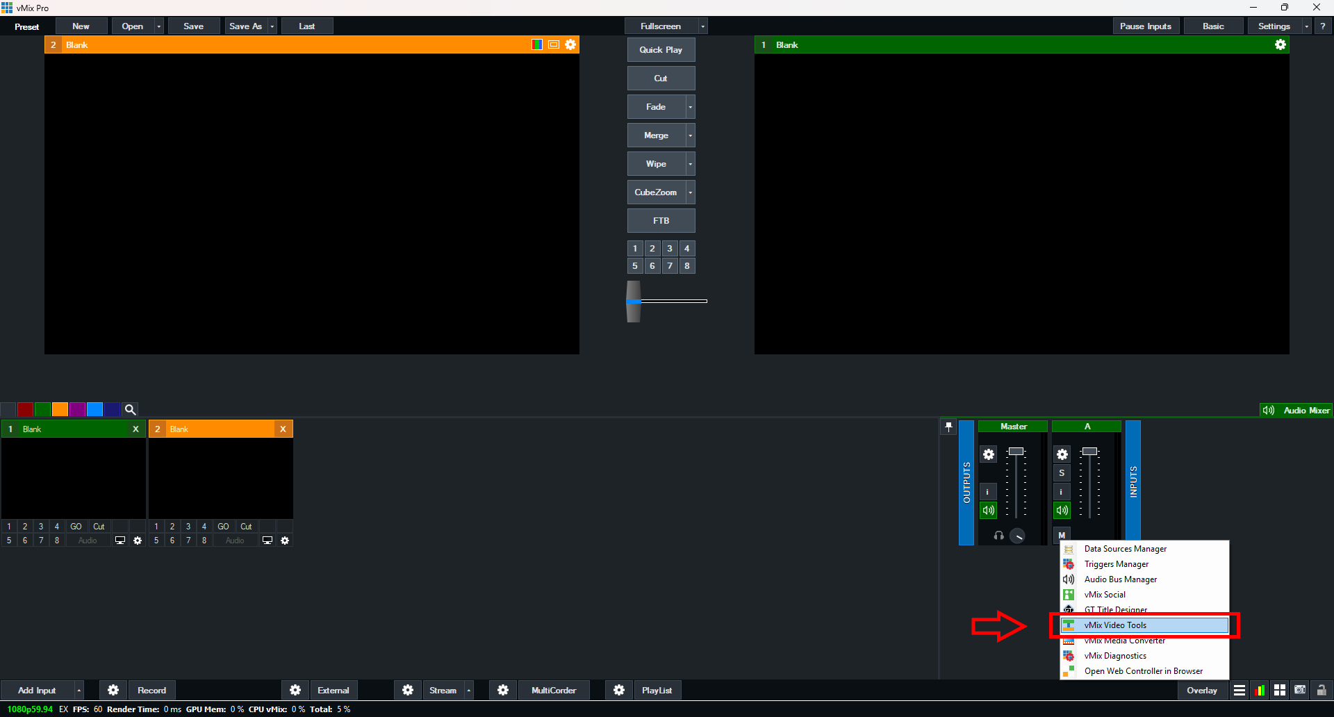 Step 1) Open vMix Video Tools. You can find this by either searching for vMix Video Tools in your start menu. Or also by opening vMix, selecting the hamburger menu from the bottom right corner and selecting the "vMix Video Tools" option.