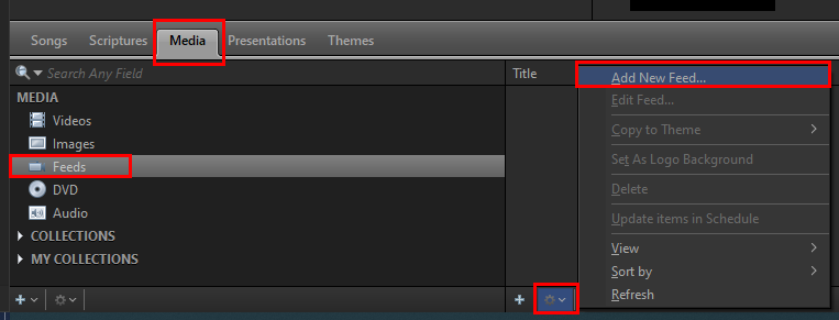 Click the little cog icon button in the middle section with the arrow next to it and select Add New Feed.