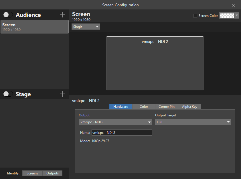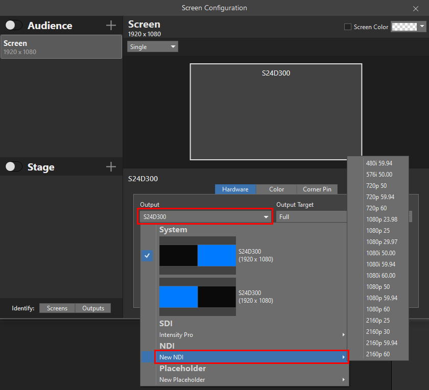 Down the bottom of this window in the Hardware tab section is a dropdown menu underneath Output. Select this and choose the New NDI option and select the resolution and frame rate setting you would like. This will generally be the same resolution and frame rate as your vMix production.