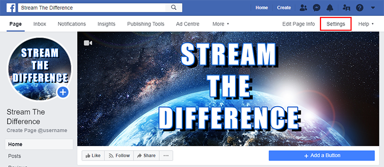 Go to your page that you would like to have live stream videos crossposted to. Select Settings from the top.
