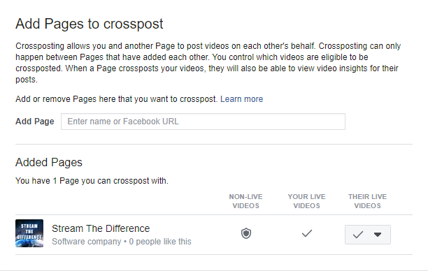 Both pages will now see similar settings under their Crossposting settings which they can adjust at any time. Now that a crossposting relationship has been established, you can now start a crossposted live stream.