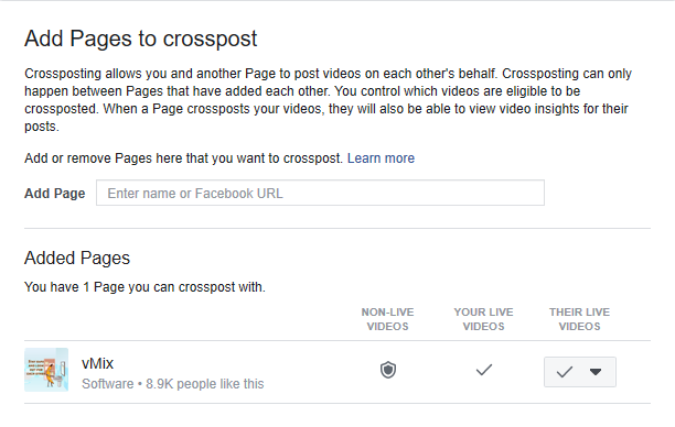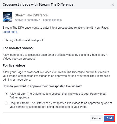 Once the admin of the other page visits this unique URL, they will see a similar window where they can choose their crossposting preferences for live videos. Once the options have been chosen, select Add.