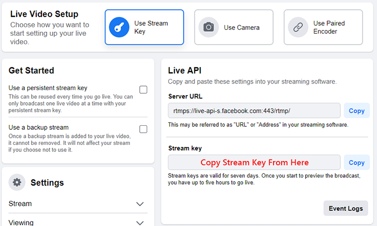 Once you have chosen all your settings, copy the Facebook Server URL and Stream key.
