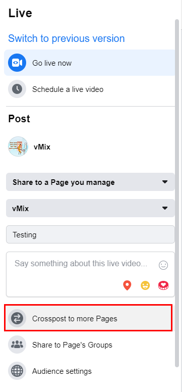Once a crossposting relationship has been established, this will give you the option to cross post a Facebook Live Stream to these other pages. To do this from vMix, you will need to setup a manual stream in Facebook with this crossposting setting enabled. Then enter in the Facebook Stream URL and Stream Key into vMix by choosing the Custom RTMP Server option.