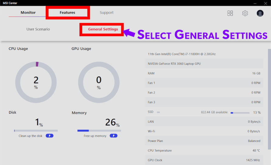 2) Once you have opened MSI Center select the Features option on the menu.
