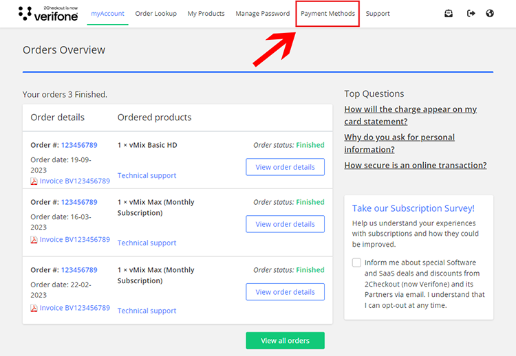 All vMix software sales and subscriptions are handled by our payment provider - 2Checkout. In order to manage your subscription including your preferred payment method, please login to your 2Checkout account portal.