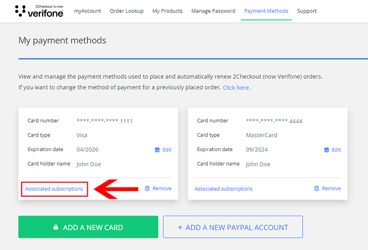 Here you will see a list of payment methods already linked to your account. To check which payment methods are associated with which subscriptions, click the Associated Subscriptions button.