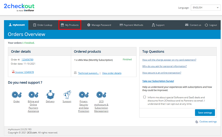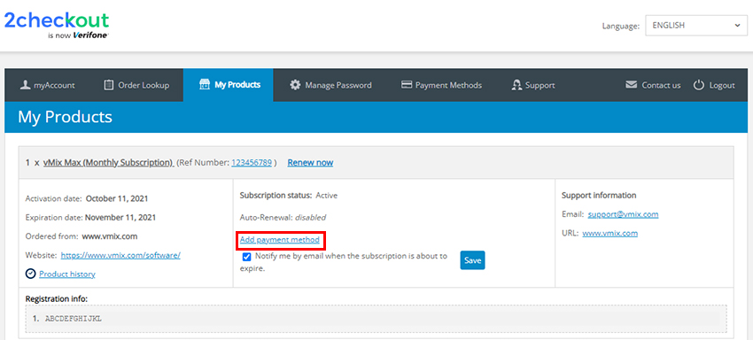 All vMix software sales and subscriptions are handled by our payment provider - 2Checkout. In order to manage your subscription including how to renew or enable auto-renewals on your vMix Max subscription, please login to your 2Checkout account portal.